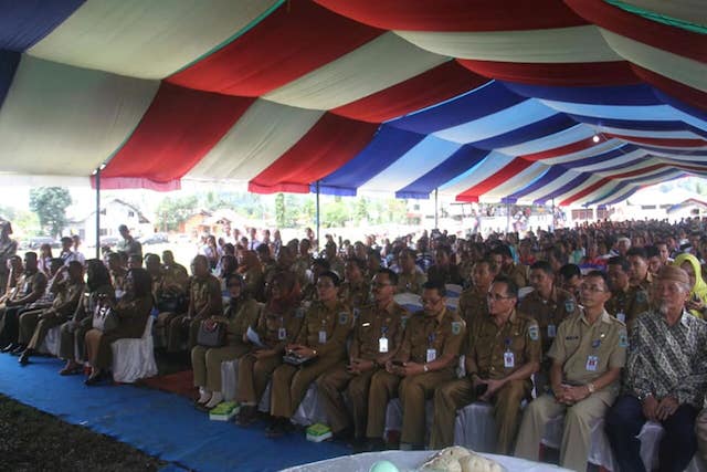BOLMONG— Bupati Bolaang Mongondow (Bolmong), Yasti Soepredjo Mokoagow menggelar audiens dengan masyarakat Kecamatan Dumoga. Pada kegiatan yang dipusatkan di Desa Pusian Induk, Kecamatan Dumoga, Senin (5/3) itu, Bupati memberikan 3000 penerima sertifikat program Pendaftaran Tanah Sistematis Lengkap (PTSL) tahun 2017. Yang secara simbolis diberikan kepada sepuluh orang perwakilan.