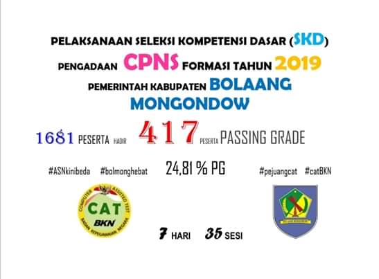 BOLMONG – Sebanyak 417 peserta tes Seleksi Kompetensi Dasar (SKD) CPNS Kabupaten Bolaang Mongondow (Bolmong) hingga Senin, (24/2). Sekretaris BKPP Bolmong Abdusalam Bonde mengatakan, ada 417 Peserta yang mencapai nilai passing grade atau sekitar 24,81 persen dari total 1681 peserta, dan yang tidak ikut seleksi sebanyak 36 orang.