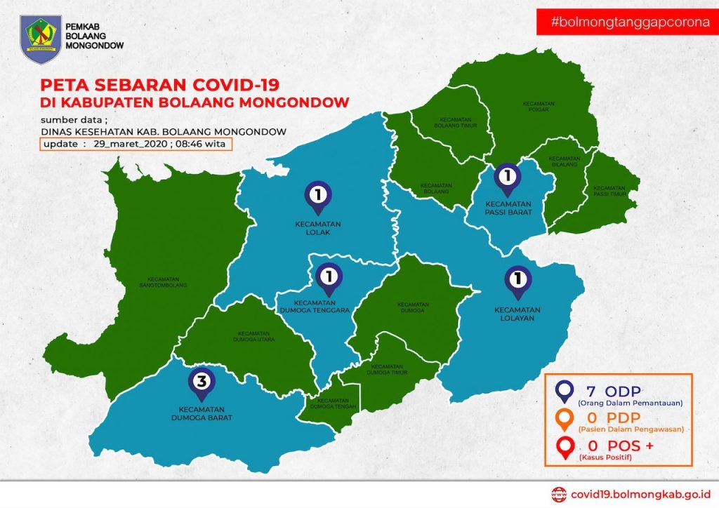 BOLMONG – Setelah sempat berkurang menjadi satu orang pada daftar Orang Dalam Pemantauan (ODP) Virus Corona (Covid-19). Pagi tadi Minggu (29/3) pukul 08.46 wita, Dinas Kesehatan Kabupaten Bolaang Mongondow (Bolmong) merilis ODP menjadi tujuh orang di peta sebaran. Mereka dari Kecamatan Lolak 1 orang, Passi Barat 1 orang, Dumoga Barat 3 orang, Dumoga Tenggara 1 orang, dan Lolayan 1 orang. ”Iya benar. Mereka yang pulang dari kegiatan BKMT, ada yang pulang pelesiran, dan mahasiswa,” kata kepala Dinas Kesehatan Bolmong, dr Erman Paputungan.