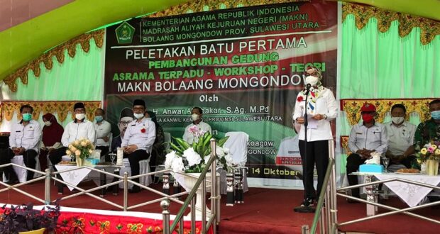 BOLMONG – Bupati Bolaang Mongondow (Bolmong) Yasti Soepredjo Mokoagow, meletakkan batu pertama pembangunan gedung asrama terpadu, gedung workshop dan gedung teori Madrasah Aliyah Kejuruan Negeri (MAKN) di Desa Dulangon, Kecamatan Lolak, Rabu, (14/10).