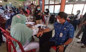 Pelaksanakan Vaksinisasi ini dilakukan di Aula Kantor Dinas Pemberdayaan Perempuan dan Perlindungan Anak (DP3A), Kamis(18/3).