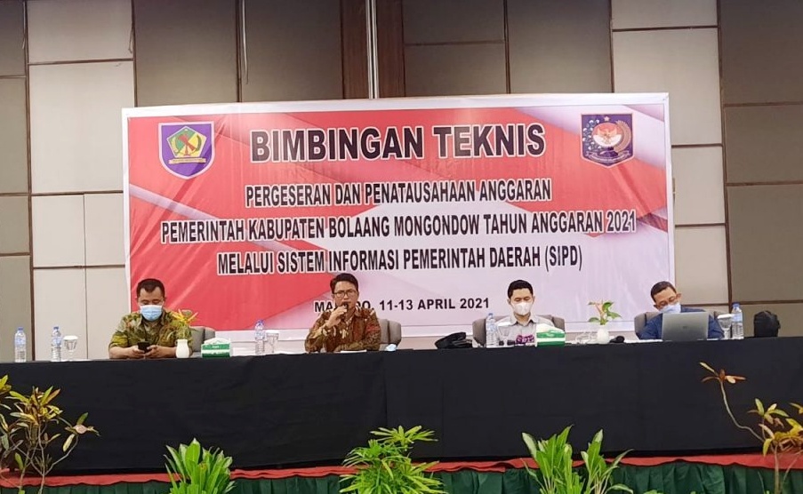BOLMOMG – Pemerintah Kabupaten Bolaang Mongondow (Bolmong) menggelar bimbingan teknis (Bimtek) pergeseran dan penatausahaan anggaran 2021 Pemkab Bolmong melalui sistem Iinformasih pemerintah daerah (SIPD), Senin (12/4). Sebanyak 126 peserta yang terdiri dari Sekretaris Dinas/Badan, Kasubag Program dan bendahara di masing-masing organisasi perangkat daerah (OPD) di lingkup Pemkab Bolmong, mengikuti kegiatan yang berlangsung di Mercure Hotel, Tateli.