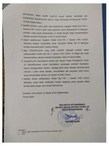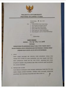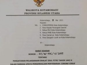 Kotamobagu – Pemerintah Kota (Pemkot) Kotamobagu resmi menerbitkan Surat Edaran (SE) tentang pengaturan pelaksanaan shalat Idul Fitri 1442 Hijiriah ditengah upaya pengendalian Covid-19.