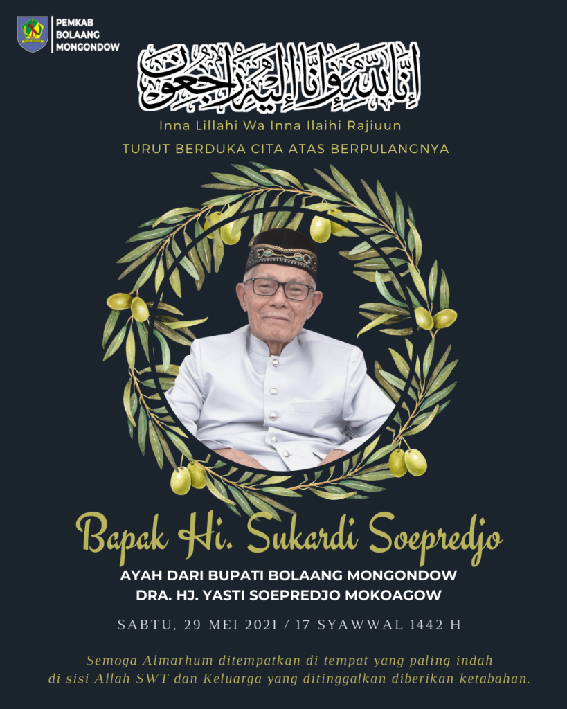 BOLMONG – Duka menyelimuti keluarga besar Bupati Bolaang Mongondow (Bolmong) Yasti Soepredjo Mokoagow. Ayahanda Hi Sukardi Soepredjo, tutup usia pada pukul 20.25 Wita di usia 88 tahun, Sabtu (29/5).