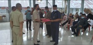 Kotamobagu – Mewakili Walikota Ir Hj Tatong Bara, Sekertaris Daerah (Sekda) Kotamobagu, Ir Sande Dodo ST, MT, menyerahkan Surat Keputusan (SK) Walikota Kotamobagu bernomor 69 Tahun 2021, tentang pengangkatan pengurus Badan Ta’mirul Masjid (BTM) Masjid Agung Baitul Makmur (MABM) Kota Kotamobagu.