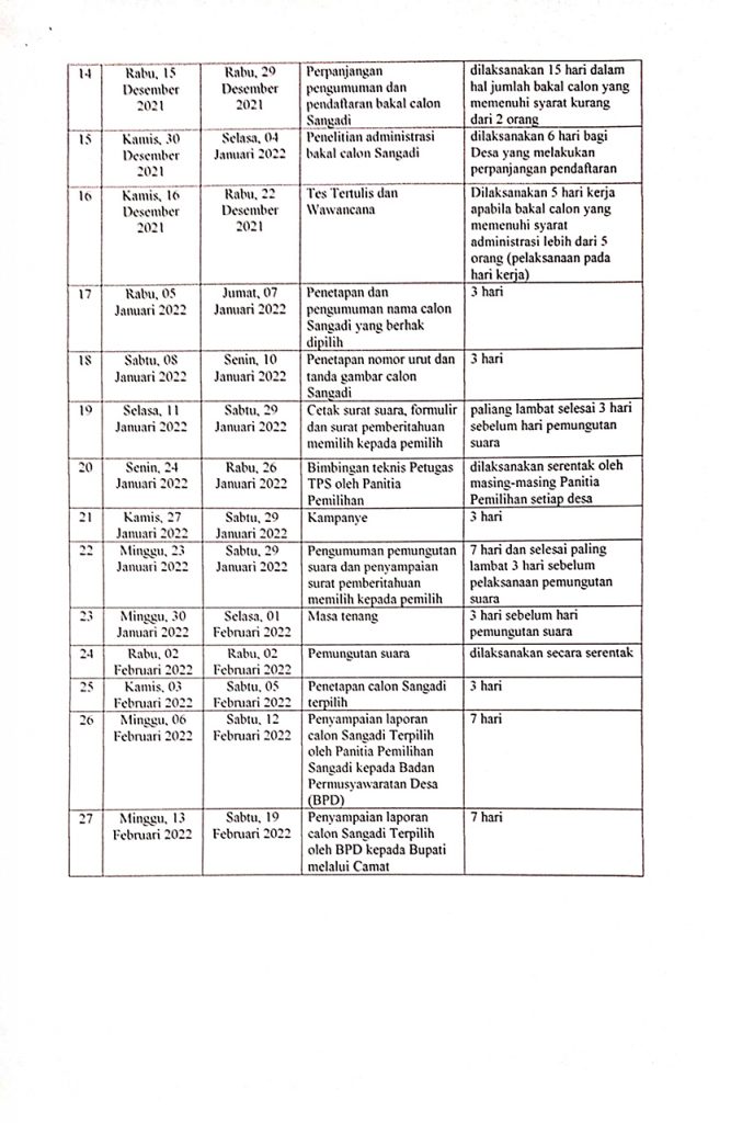 BOLMONG – Pemerintah Kabupaten Bolaang Mongondow (Bolmong) melalui Dinas Pemberdayaan Masyarakat Desa (DPMD), merilis resmi jadwal tahapan pelihan sangadi (kepala desa) di Bolmong. Surat yang ditandatangani Sekda Bolmong Tahlis Gallang itu bernomor 100/D.24/DPMD/244/X/2021 tertanggal 22 Oktober 2021. Kepala DPMD Bolmong Abdussalam Bonde SHI MAP mengatakan, tahapan pemilihan sangadi di 96 desa sudah termasuk pemilihan ulang Desa Insil Baru. “Tahapan akan berlangsung selama 5 bulan,” kata Bonde. Berikut ini jadwalnya :