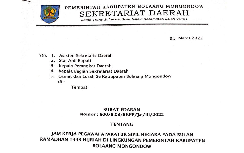 BOLMONG – Menindaklanjuti surat edaran Menteri Pendayagunaan Aparatur Negara, dan Reformasi Birokrasi Republik Indonesia, Nomor 11Tahun 2022 tentang penetapan jam kerja ASN pada bulan Ramadhan 1443 H. Pemerintah Kabupaten (Pemkab) Bolaang Mongondow (Bolmong) menetapkan, melakukan perubahan jam kerja, bagi Organisasi Perangkat Daerah (OPD). Diketahui, untuk memberlakukan 5 hari kerja yakni dimulai hari Senin sampai Kamis jam kerjanya yakni dari pukul 08.00 wita sampai dengan 15.00 wita, dan waktu istirahat yakni pukul 12.00 wita hingga 12.30 wita. Sementara untuk hari Jumat yaitu dari pukul 08.00 wita sampai dengan 15.30 wita, dan waktu istirahatnya dari pukul 11.30 wita sampai dengan 12.30 wita.