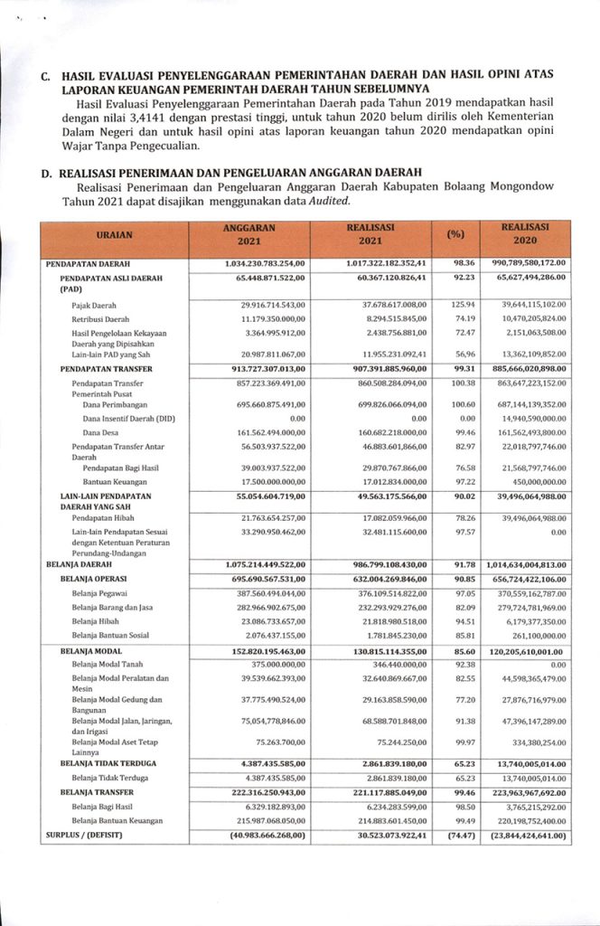 Ringkasan Laporan Penyelenggaraan Pemerintah Daerah (RLPPD) Kabupaten Bolmong Tahun 2021