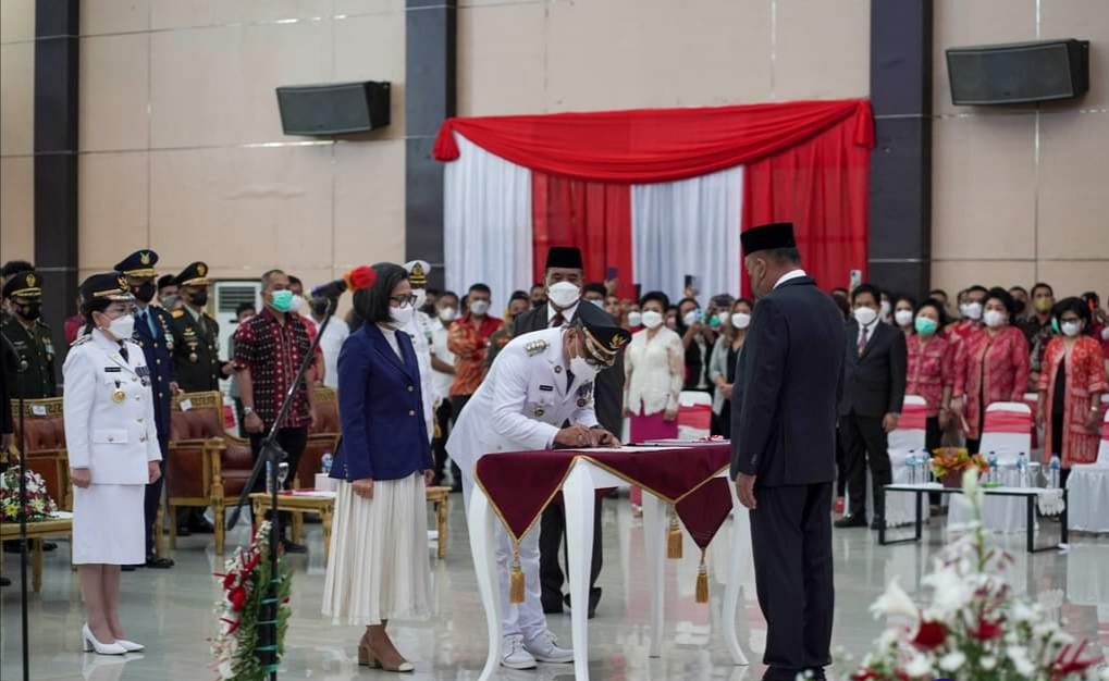 BOLMONG – Gubernur Sulawesi Utara (Sulut) Olly Dondokambey, melantik dan mengambil sumpah Ir Limi Mokodompit MM sebagai Pj Bupati Bolaang Mongondow (Bolmong), di gedung graha gubernuran bumi beringin, Manado, Minggu, (22/05/2022).