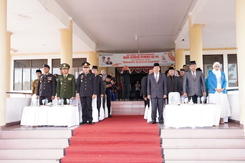 BOLMONG – Pemerintah Kabupaten Bolaang Mongondow (Bolmong), menggelar upacara peringatan Hari Sumpah Pemuda ke-94 Tahun 2022, Jumat (28/1/2022). Sekretaris Daerah (Sekda) Tahlis Gallang bertindak sebagai Inspektur Upacara (Irup). Turut hadir para Asisten Pemkab Bolmong, para Kepala OPD, Ketua KNPI Bolmong Feramitha Tiffany Mokodompit, unsur Forkopimda, sert para ASN, staf dan peserta upacara. Dalam kesempatan itu, Tahlis membacakan Sambutan Menteri Pemuda dan Olahraga (Menpora) RI, Zainudin Amali, menyampaikan, peringatan hari Sumpah Pemuda, adalah sejarah masa lalu untuk direnungi, dipelajari dan dijadikan teladan serta inspirasi.