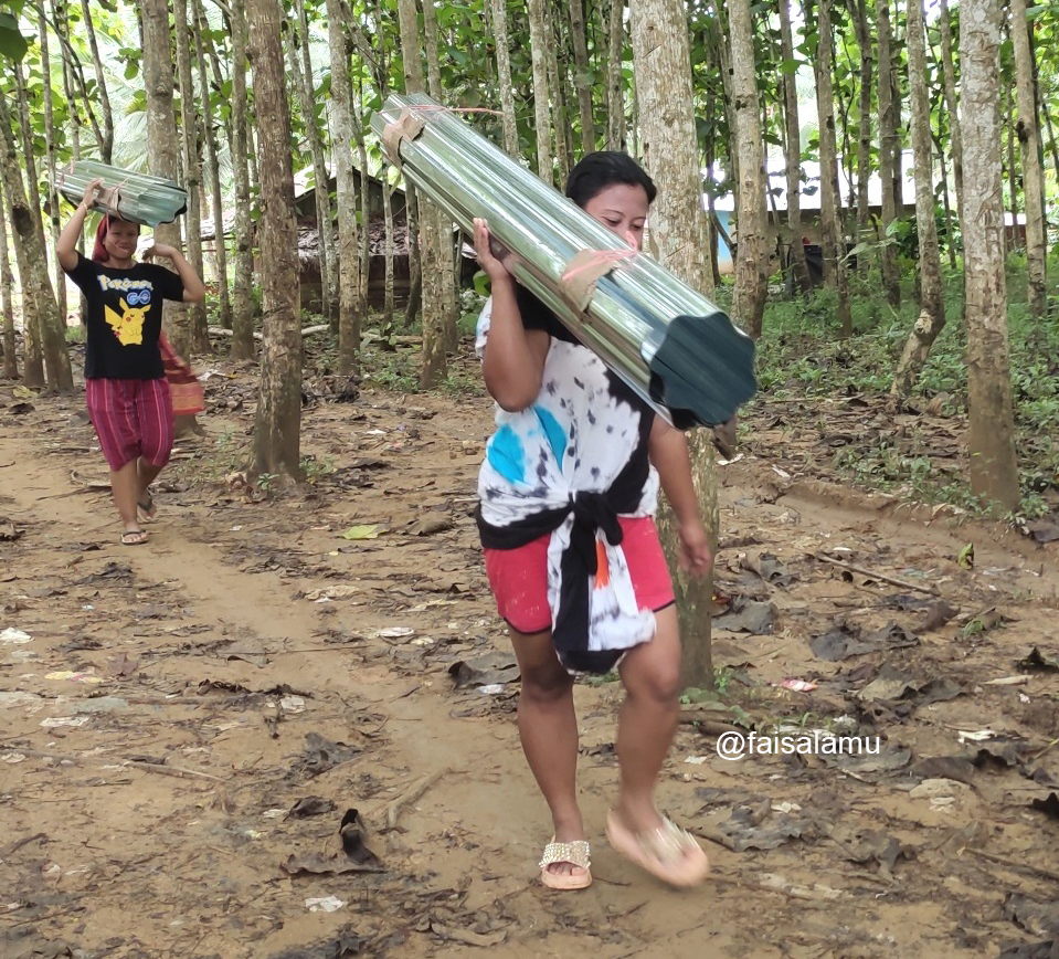 Perempuan di Kampung Tini’ bergotong royong mengangkat seng untuk pembangunan mushola. (foto:faisal amu)