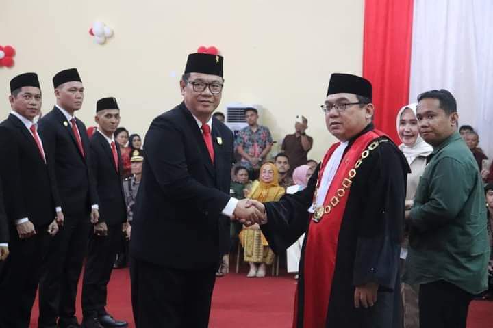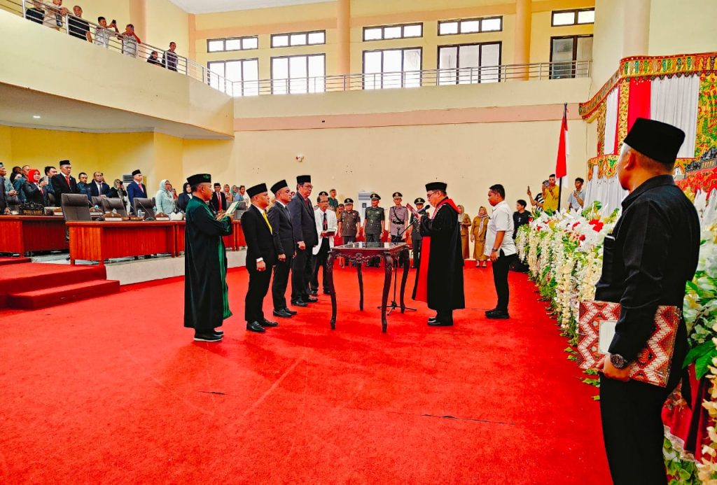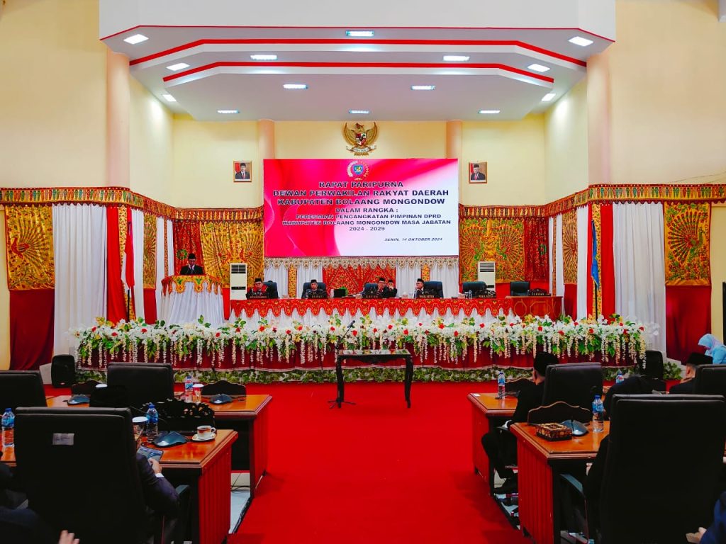 BOLMONG – Pimpinan Dewan Perwakilan Rakyat Daerah (DPRD) Kabupaten Bolaang Mongondow (Bolmong) resmi dikukuhkan Senin 14 Oktober 2024, di Kantor DPRD Bolmong. Tiga pimpinan DPRD yang dikukuhkan melalui proses paripurna persemian pengangkatan pimpinan DPRD Kabupaten Bolaang Mongondow masa jabatan Tahun 2024 – 2029 itu, masing-masing Tonny Tumbelaka dari PDI Perjuangan sebagai Ketua, Febrianto Tangahu dari Partai NasDem sebagai Wakil Ketua dan Sulhan Manggabarani dari Partai Golkar sebagai Wakil Ketua. Ketua Pengadilan Negeri Kotamobagu, Jifly Adam SH MH memimpin langsung proses pengambilan sumpah janji tiga pimpinan DPRD masa jabatan 2024-2029. Tonny Tumbelaka bersama kedua wakilnya mengucapkan sumpah janji jabatan di hadapan seluruh anggota DPRD serta undangan yang hadir, termasuk Penjabat Bupati Bolmong, dr Jusnan C Mokoginta MARS yang diwakili Asisten II Deddy Mokodongan.
