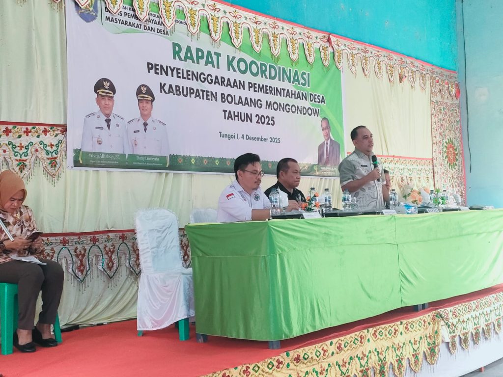 BOLMONG – Balai Desa Tungoi, Kecamatan Lolayan, berubah menjadi pusat pertemuan strategis pada Kamis (4/12/2025) ketika ratusan perangkat desa se-Kabupaten Bolaang Mongondow (Bolmong) berkumpul dalam Rapat Koordinasi Penyelenggaraan Pemerintahan Desa Tahun 2025. Forum besar ini resmi dibuka oleh Bupati Bolmong, Yusra Alhabsyi, dan menjadi penanda dimulainya penguatan arah pembangunan desa di tahun mendatang. Rakor tersebut mempertemukan struktur pemerintahan dari berbagai tingkatan. Hadir Asisten I sekaligus Plt Kepala Dinas PMD, Deker Rompas, Plt Asisten II Renti Mokoginta, seluruh camat, serta para Sangadi dari 200 desa. Ruang pertemuan pun menjelma menjadi arena konsolidasi besar mengenai bagaimana desa harus bergerak, melayani, dan mengelola pembangunan secara lebih modern dan bertanggung jawab.